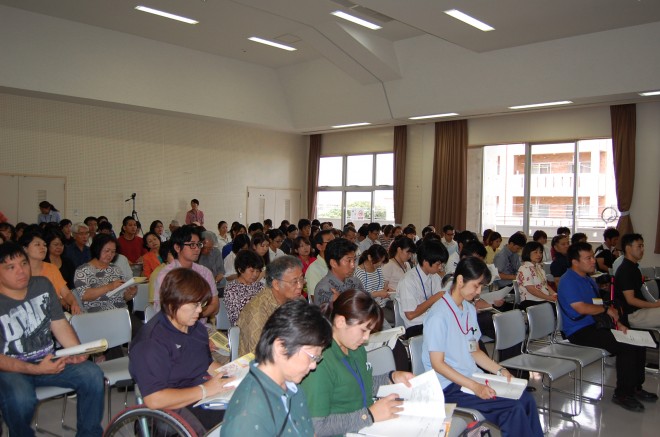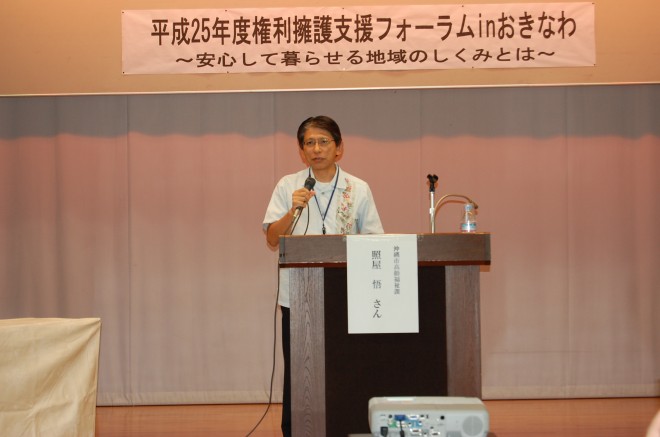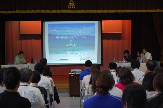 『権利擁護支援フォーラムinおきなわ』が平成23年11月の開催に続き、今回は主催を全国権利擁護支援ネットワーク、共催は沖縄市社会福祉協議会、そして、 後援を沖縄市の協力をいただき、8月30日(金) 沖縄市福祉文化プラザにて、開催されました。会場には沖縄市民・福祉関係・行政・社会福祉協議会の方々106名の参加がありました。