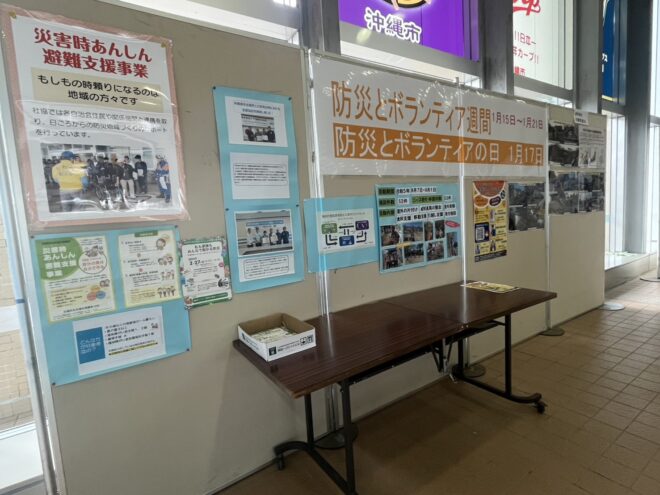 令和8年1月13日(火)~16日の期間、沖縄市役所市民ロビーにて防災とボランティアの日(1月17日)のパネル展を開催しております。