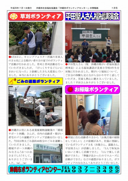 沖縄市社協ボランティアセンターの広報紙「ぼらなび」の7月号を発行しました。今回は、ボランティア講座の様子や、旧盆助け合いお掃除ボランティア募集のお知らせなどを掲載しています。
