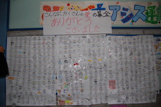 宮里小学校では、募金すると名前を記入した募金箱のふたを校内掲示板に貼って、赤い羽根共同募金を盛り上げていきましたと、校長先生と教頭先生から話がありました。